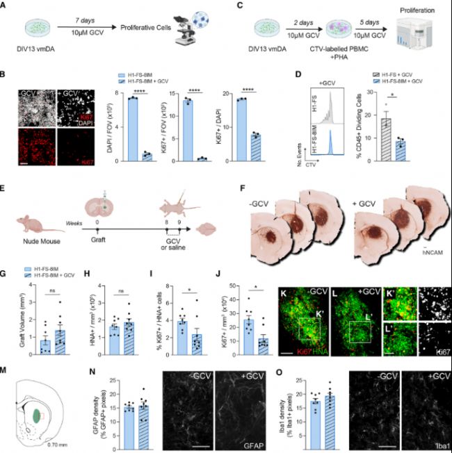針對免疫逃逸的主要擔(dān)憂之一就是會引發(fā)惡性腫瘤的風(fēng)險(xiǎn),之前研究人員向 H1-FS-8IM 細(xì)胞中轉(zhuǎn)入了HSV-TK 基因,通過GCV(更昔洛韋)處理,可針對異常增殖的細(xì)胞啟動(dòng)HSV-TK 自殺基因系統(tǒng),精準(zhǔn)識別增殖細(xì)胞并誘導(dǎo)其凋亡。隨后研究人員利用GCV處理DIV13 vmDA 神經(jīng)元及DIV13 vmDA 神經(jīng)元與免疫細(xì)胞共培養(yǎng)體系,通過免疫熒光染色及細(xì)胞流式分析發(fā)現(xiàn),H1-FS-8IM細(xì)胞中激活自殺系統(tǒng)的同時(shí)對其免疫逃逸作用沒有顯著影響(圖4A-D)。以免疫缺陷裸鼠為模型,驗(yàn)證更昔洛韋(GCV)對 H1-FS-8IM 神經(jīng)移植物的安全管控作用:GCV 處理組的H1-FS-8IM 神經(jīng)移植物在顯著清楚異常增殖細(xì)胞的同時(shí),不損傷其包括移植物體積、移植物細(xì)胞密度、神經(jīng)元分化狀態(tài)及體內(nèi)微環(huán)境等正常功能(圖4E-O),為該細(xì)胞的臨床安全應(yīng)用提供了體內(nèi)證據(jù)。
