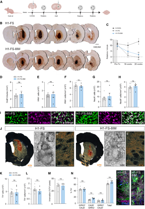 核心結(jié)論:H1-FS-8IM 神經(jīng)移植物在帕金森模型裸鼠中可長期存活、分化為多巴胺能神經(jīng)元,并與宿主腦區(qū)實(shí)現(xiàn)功能整合,最終改善模型動(dòng)物的運(yùn)動(dòng)功能,驗(yàn)證了其作為帕金森細(xì)胞治療產(chǎn)品的潛力。