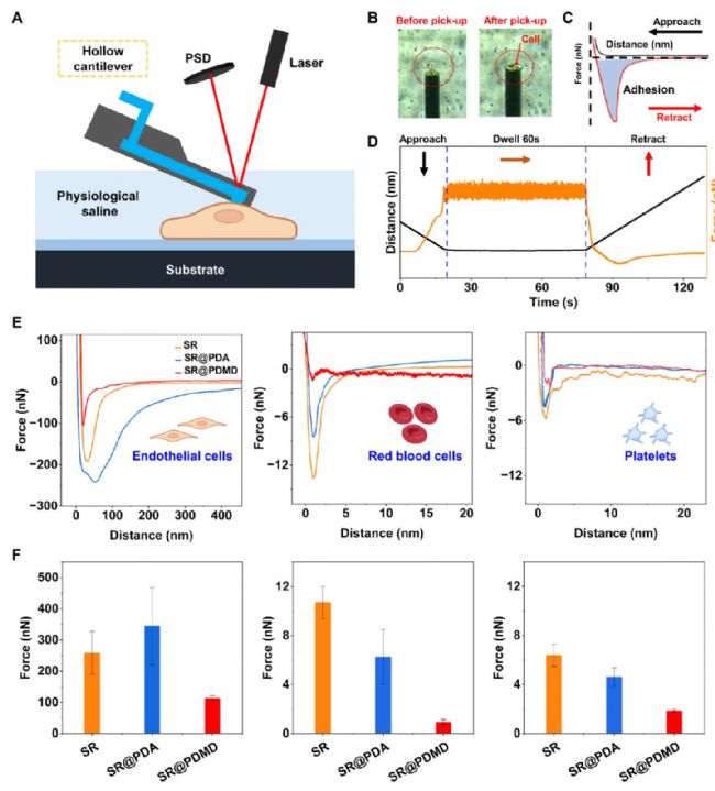 研究中,團(tuán)隊(duì)將FluidFM的無針尖懸臂梁通過微通道施加負(fù)壓,將單個(gè)細(xì)胞(內(nèi)皮細(xì)胞、紅細(xì)胞或血小板)固定在懸臂梁頂端(圖A、B)。隨后,控制懸臂梁靠近涂層表面并停留60秒,再緩慢撤回,同時(shí)記錄力-距離曲線(圖C、D)。曲線中的峰值力代表細(xì)胞與表面的最大黏附力,曲線下面積則反映黏附能量。
