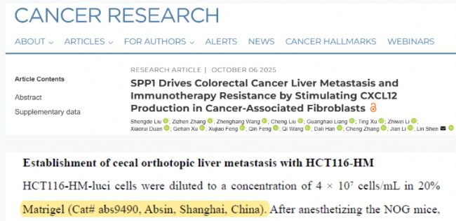 在這項高質(zhì)量研究中,Absin 的 基質(zhì)膠(貨號:abs9490)作為關(guān)鍵實驗材料,全程支持了盲腸原位肝轉(zhuǎn)移模型的構(gòu)建,為模擬臨床真實轉(zhuǎn)移場景、驗證治療效果提供了可靠的體外 / 體內(nèi)微環(huán)境基礎(chǔ)。