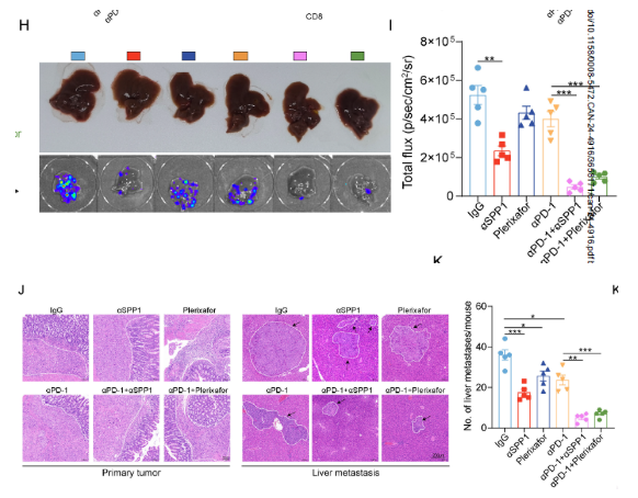 抗 SPP1 抗體或 plerixafor(CXCR4 拮抗劑)聯(lián)合抗 PD-1,可使 CRLM 小鼠肝轉(zhuǎn)移灶減少 50% 以上(H&E 染色);