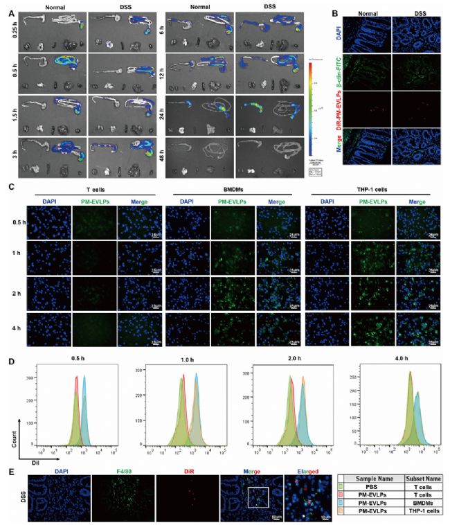 體內(nèi)生物分布顯示,DiR標(biāo)記的PM-EVLPs口服后在DSS結(jié)腸炎小鼠中優(yōu)先富集于炎癥結(jié)腸組織,24h達(dá)峰值,48h基本清除(Fig.3A)。免疫熒光顯示其主要定位于結(jié)腸黏膜層固有層(Fig.3B)。細(xì)胞攝取實驗表明,巨噬細(xì)胞(BMDMs和THP-1細(xì)胞)對PM-EVLPs的攝取效率顯著高于T細(xì)胞(Fig.3C-D)。結(jié)腸組織共定位實驗證實,PM-EVLPs可被F4/80⁺巨噬細(xì)胞內(nèi)化(Fig.3E)。