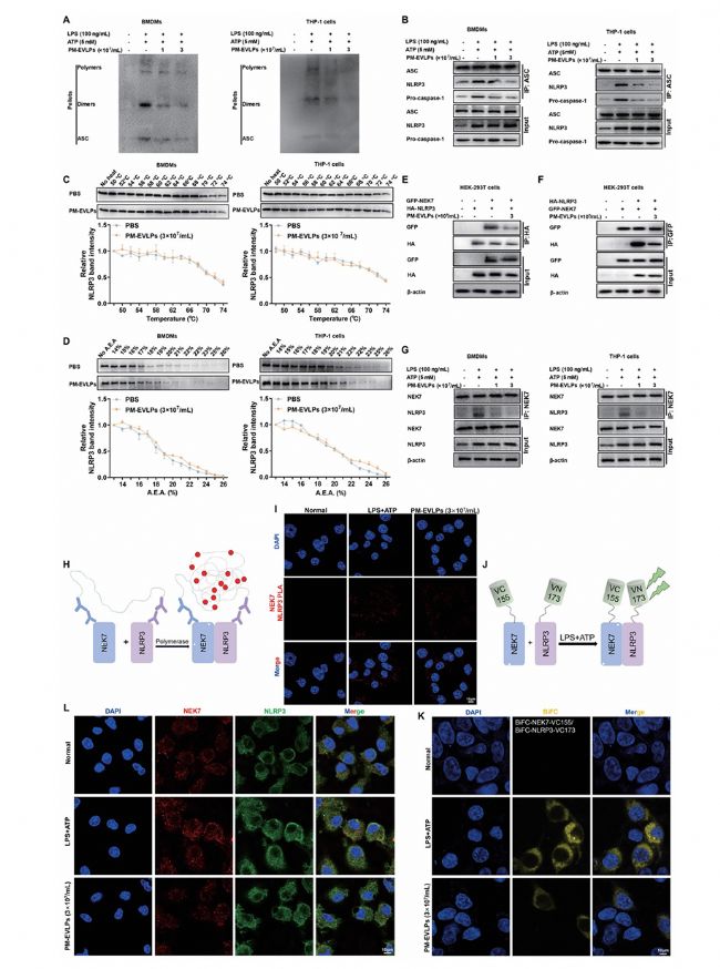 PM-EVLPs 不影響 NLRP3 炎癥小體激活的啟動信號(NF-κB 通路),對線粒體 ROS 生成、K⁺外流及 Ca²⁺內(nèi)流亦無顯著作用。Co-IP 結(jié)果顯示,PM-EVLPs 可抑制 ASC 寡聚化及 NLRP3/ASC/pro-caspase-1 復(fù)合物形成(Fig.6A-B)。CETSA 與 SIP 實驗表明,PM-EVLPs 不直接結(jié)合 NLRP3(Fig.6C-D)。PLA、BiFC 及免疫熒光實驗證實,PM-EVLPs 可顯著抑制 NEK7 與 NLRP3 的相互作用(Fig.6E-L),進(jìn)而阻斷炎癥小體組裝。