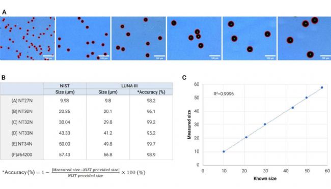 LUNA-III™自動細胞計數(shù)儀計數(shù)的NIST可溯源粒徑標準(NT27N、NT30N、NT32N、NT33N、NT34N、#64200)圖像,紅色圓圈標示檢測出的顆粒。(B)表格對比NIST標準粒徑尺寸與點成LUNA-III™測量值及其精度百分比。(C)散點圖顯示了