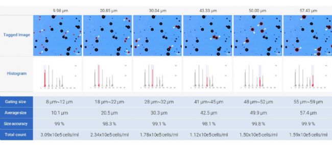 實驗使用3T3細胞系,其培養(yǎng)基為含10%胎牛血清和1%的DMEM。細胞存活率評估采用0.4%臺盼藍(貨號 T13101)。此外為了驗證尺寸測量的精度,實驗使用了六種NIST可溯源粒徑標準(9.98、20.85、30.04、43.33、50.00和57.43 µm)。