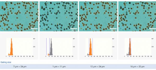 LUNA-III™自動細胞計數(shù)儀根據(jù)尺寸篩選3T3細胞(已知尺寸約18 µm)的能力,我們設定了多個尺寸分選范圍7~24 µm、1~11 µm、12~24 µm、16~20 µm(圖 3)。結(jié)果顯示,