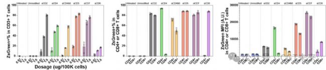 使用公開的轉(zhuǎn)錄組數(shù)據(jù)和流式細(xì)胞術(shù)分析T細(xì)胞表面受體(CD2、CD4、CD5、CD7、CD8)的表達(dá)水平,CD2的表達(dá)量最高,是CD7和CD5的5倍,但CD2的mRNA遞送效率遠(yuǎn)低于CD7和CD5。