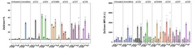 使用ZsGreen報(bào)告基因mRNA作為tLNP的負(fù)載物,在人類T細(xì)胞中進(jìn)行遞送實(shí)驗(yàn),靶向CD7的tLNP在CD4⁺和CD8⁺ T細(xì)胞中均表現(xiàn)出最高的遞送效率和蛋白表達(dá)水平,aCD7/tLNP的ZsGreen陽性率高達(dá)76.4%,顯著優(yōu)于其他靶向分子。