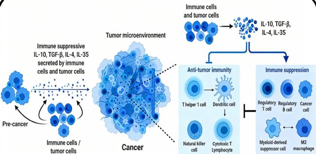 機(jī)制研究表明,腫瘤微環(huán)境并非IL-4的直接主要來(lái)源。出乎意料的是,骨髓組織內(nèi)部的嗜堿性粒細(xì)胞被鑒定為腫瘤條件下IL-4的主要生產(chǎn)者。研究者提出一個(gè)系統(tǒng)性調(diào)控模型:腫瘤可能釋放某些可溶性因子進(jìn)入循環(huán),遠(yuǎn)程作用于骨髓中的嗜堿性粒細(xì)胞,刺激其產(chǎn)生IL-4。隨后,這些局部分泌的IL-4以旁分泌或自分泌方式,作用于鄰近的、表達(dá)IL-4受體的粒-單核祖細(xì)胞。IL-4信號(hào)的激活,重編程了這些祖細(xì)胞的轉(zhuǎn)錄狀態(tài),驅(qū)動(dòng)其向具有免疫抑制特性的髓系細(xì)胞(如特定的單核細(xì)胞來(lái)源巨噬細(xì)胞亞群)分化與擴(kuò)增。這些被"教育"過(guò)的髓系前體細(xì)胞進(jìn)入外周循環(huán),并遷移至腫瘤部位,進(jìn)一步分化為具有強(qiáng)大免疫抑制功能的成熟細(xì)胞,從而壓制抗腫瘤免疫應(yīng)答,促進(jìn)腫瘤生長(zhǎng)。