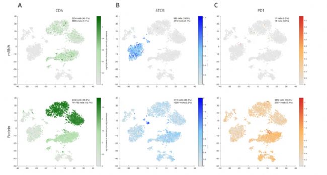 針對(duì) CD4、γδTCR 受體等表達(dá)不相關(guān)的分子,蛋白數(shù)據(jù)可劃分出更精細(xì)的細(xì)胞亞群;