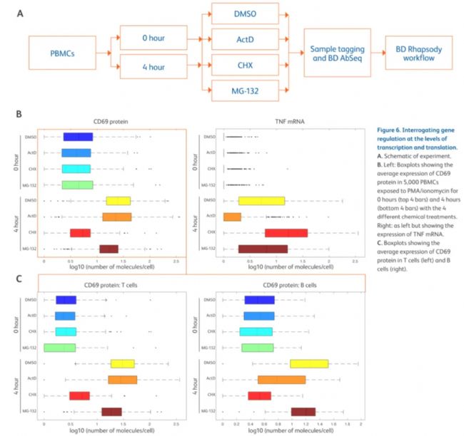 通過小分子抑制劑分別抑制 PBMC 激活過程中的轉(zhuǎn)錄、翻譯及蛋白酶體活性,結(jié)合 BD AbSeq 與 BD Rhapsody 平臺(tái)可發(fā)現(xiàn):