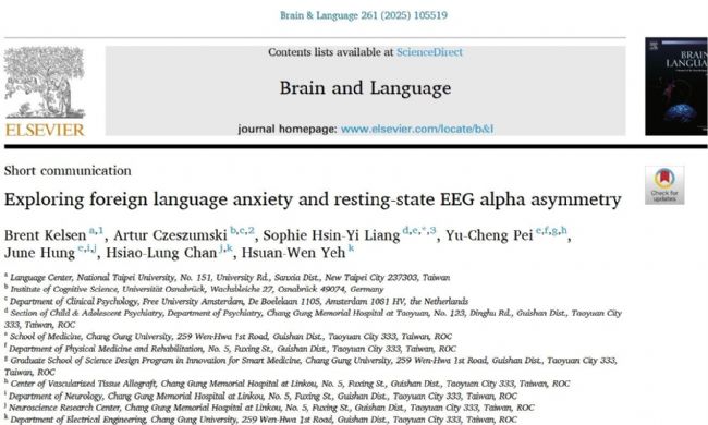 Kelsen, B., Czeszumski, A., Liang, S. H.-Y., Pei, Y.-C., Hung, J., Chan, H.-L., & Yeh, H.-W. (2025). Exploring foreign language anxiety and resting-state EEG alpha asymmetry. Brain and Language, 261, 105519.