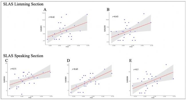 對于口語部分的領域,SLASSCOG、SLASSBEH和SLASSSOM均出現(xiàn)統(tǒng)計學上顯著的正相關結果。