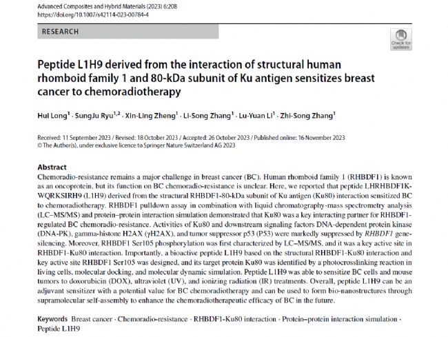 2023年11月16日南開大學(xué)李魯遠(yuǎn)與張智松等學(xué)者在Advanced Composites and Hybrid Materials 發(fā)表題為Peptide L1H9 derived from the interaction of structural human rhomboid family 1 and 80‑kDa subunit of Ku antigen sensitizes breast cancer to chemoradiotherapy的高分文章,影響因子IF=20。原文鏈接:https://doi.org/10.1007/s42114-023-00784-4