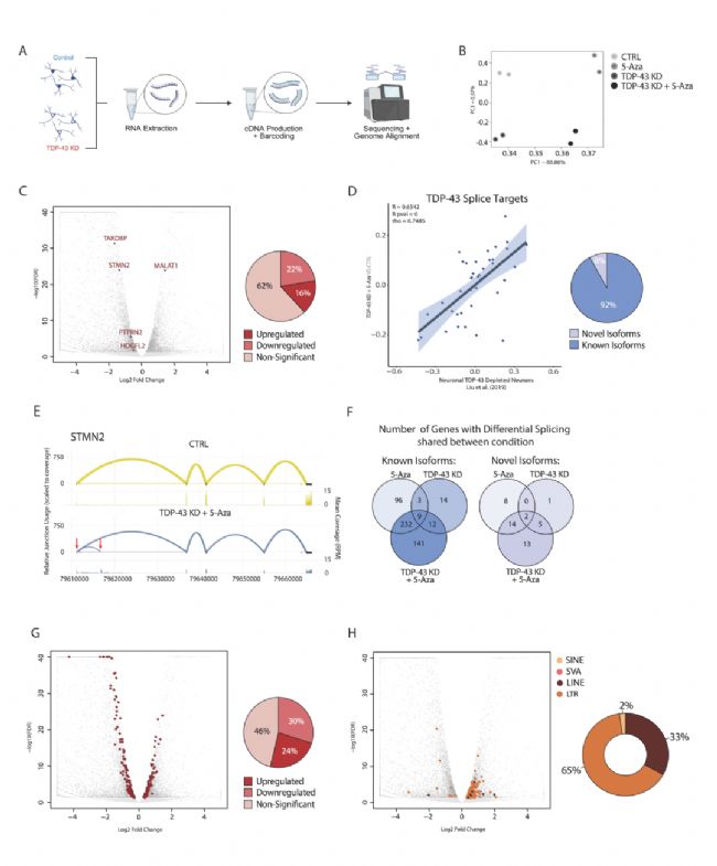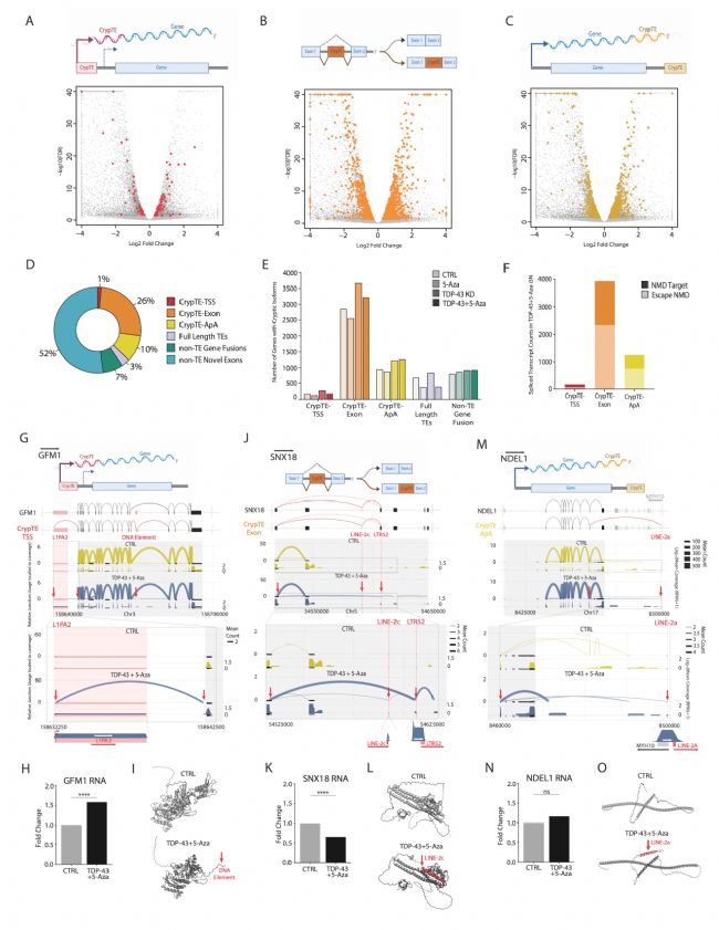 研究者構(gòu)建了由iPSC誘導(dǎo)分化的皮質(zhì)興奮性神經(jīng)元模型(i3Neurons),通過(guò)CRISPRi在i3Neurons中敲低TDP-43并進(jìn)行了驗(yàn)證(mRNA和蛋白均減少約2-3倍),同時(shí)加入5-Azacytidine抑制NMD以穩(wěn)定隱性轉(zhuǎn)錄本便于檢測(cè)。短讀長(zhǎng)RNA-seq顯示,TDP-43缺失導(dǎo)致已知靶基因(如STMN2、HDGFL2)表達(dá)異常和轉(zhuǎn)座子(尤其是LTR和LINE家族)顯著上調(diào),且剪接變化與ALS/FTD患者神經(jīng)元高度相關(guān)。由于短讀長(zhǎng)測(cè)序難以解析重復(fù)序列和組裝全長(zhǎng)轉(zhuǎn)錄本,研究者進(jìn)一步采用基于PacBio HiFi優(yōu)化的長(zhǎng)讀長(zhǎng)測(cè)序(CrypTE-seq)發(fā)現(xiàn)了數(shù)千種新轉(zhuǎn)錄本,捕獲了包含重復(fù)序列的轉(zhuǎn)座子和全長(zhǎng)轉(zhuǎn)錄本,剪接異構(gòu)體以及大量基因-TE融合的隱性剪接事件(crypTEs),為后續(xù)功能研究奠定了基礎(chǔ)。