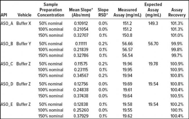 研究表明,SoloVPE系統(tǒng)的斜率光譜法對(duì)于化學(xué)修飾的ASO藥物來說,是一種準(zhǔn)確、精密、耐用且符合ICH Q2(R1)驗(yàn)證要求的方法。該方法可在多個(gè)場(chǎng)地普遍實(shí)施,并在產(chǎn)品轉(zhuǎn)移過程中獲得一致的結(jié)果。