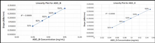 在目標(biāo)濃度的50%至150%范圍內(nèi),ASO_B和ASO_D的線性回歸擬合度R²均達(dá)到了0.9999,線性良好(圖4)。