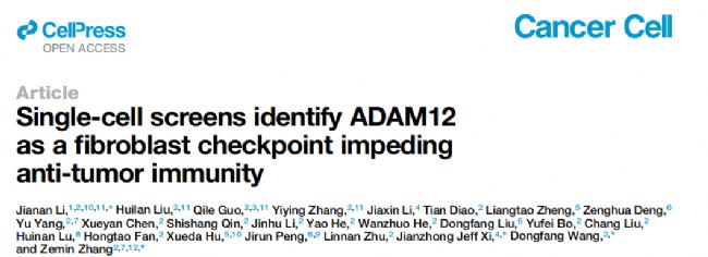 2026年1月15日,北京大學(xué)張澤民、王東方、席建忠、昌平實(shí)驗(yàn)室李佳楠共同通訊在Cancer Cell(IF=44.5)在線發(fā)表題為“Single-cell screens identify ADAM12 as a fibroblast checkpoint impeding anti-tumor immunity”的研究論文。該研究利用單細(xì)胞篩選鑒定ADAM12為阻礙抗腫瘤免疫的成纖維細(xì)胞關(guān)卡。