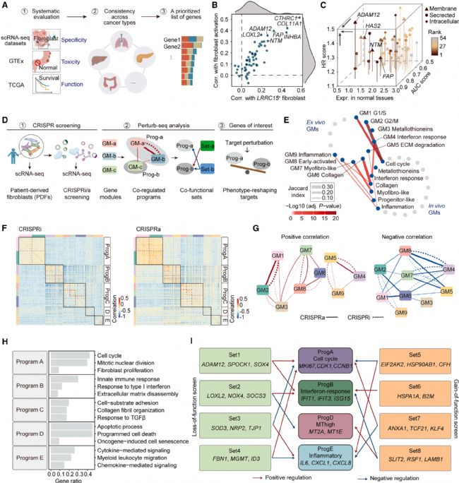 為系統(tǒng)鑒定成纖維細(xì)胞關(guān)鍵調(diào)節(jié)因子,研究團(tuán)隊(duì)首先整合人類(lèi)癌癥單細(xì)胞測(cè)序數(shù)據(jù)、GTEx正常組織數(shù)據(jù)和TCGA生存數(shù)據(jù),設(shè)定成纖維細(xì)胞富集、腫瘤特異性表達(dá)及與不良預(yù)后相關(guān)三個(gè)標(biāo)準(zhǔn)進(jìn)行計(jì)算機(jī)模擬篩選,最終篩選出54個(gè)候選基因(圖1A)。結(jié)果顯示,大多數(shù)候選基因與肌成纖維細(xì)胞特征呈正相關(guān)(圖1B)。綜合三個(gè)標(biāo)準(zhǔn)對(duì)候選基因進(jìn)行排序,ADAM12位列榜首,與FAP等已知調(diào)節(jié)因子一同被識(shí)別,證實(shí)了該篩選策略的可靠性(圖1C)。為在患者來(lái)源成纖維細(xì)胞中解析肌成纖維細(xì)胞活化的調(diào)控網(wǎng)絡(luò),研究團(tuán)隊(duì)開(kāi)發(fā)了優(yōu)化的CRISPRi和CRISPRa Perturb-seq系統(tǒng),構(gòu)建靶向590個(gè)和265個(gè)基因的文庫(kù),以低感染復(fù)數(shù)轉(zhuǎn)導(dǎo)結(jié)直腸癌患者來(lái)源成纖維細(xì)胞后獲得超過(guò)7萬(wàn)個(gè)高質(zhì)量單細(xì)胞轉(zhuǎn)錄組,驗(yàn)證了系統(tǒng)的高效編輯和可靠擾動(dòng)效果(圖1D)。