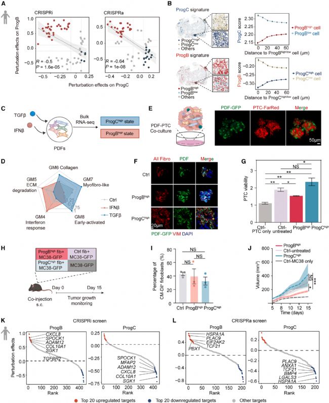 為驗(yàn)證ProgB和ProgC的功能效應(yīng),研究團(tuán)隊(duì)首先用TGF-β或IFN-β處理患者來(lái)源成纖維細(xì)胞,隨后進(jìn)行批量RNA-seq以評(píng)估表型變化,結(jié)果顯示TGF-β處理增強(qiáng)ProgC并抑制ProgB,IFN-β處理則相反,證實(shí)了ProgC和ProgB之間的拮抗關(guān)系(圖2C-D)。隨后采用患者來(lái)源成纖維細(xì)胞(PDF)-腫瘤樣細(xì)胞簇(PTC)共培養(yǎng)模型發(fā)現(xiàn),ProgC high成纖維細(xì)胞促進(jìn)了PTC的擴(kuò)張生長(zhǎng),而ProgB high成纖維細(xì)胞則抑制其生長(zhǎng)(圖2E-G)。為在體內(nèi)TME中驗(yàn)證,研究團(tuán)隊(duì)將經(jīng)TGF-β或IFN-β預(yù)處理的成纖維細(xì)胞與MC38腫瘤細(xì)胞共注射至小鼠體內(nèi)(該模型以高成纖維細(xì)胞含量為特征),結(jié)果顯示ProgC high成纖維細(xì)胞腫瘤負(fù)荷增加,而ProgB high組則減緩了腫瘤進(jìn)展(圖2H-J)。以上結(jié)果表明,與促腫瘤的ProgC高狀態(tài)相反,IFN-β誘導(dǎo)的ProgB高狀態(tài)賦予成纖維細(xì)胞內(nèi)在的抗腫瘤活性。