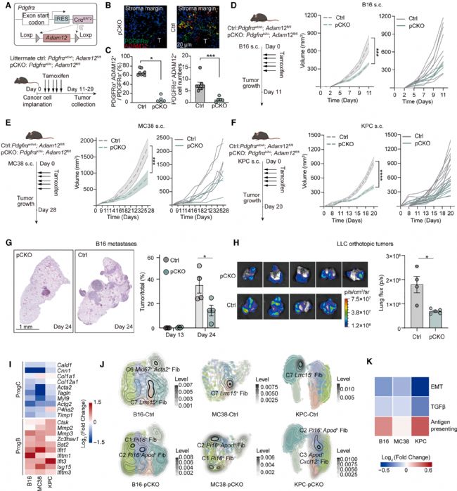 為在體內(nèi)驗(yàn)證ADAM12的促腫瘤功能,研究團(tuán)隊(duì)構(gòu)建了PdgfraCreERT2; Adam12flox/flox(Adam12-pCKO)小鼠模型,該小鼠可在他莫昔芬誘導(dǎo)后實(shí)現(xiàn)成纖維細(xì)胞特異性ADAM12缺失(圖5A),并在皮下分別接種B16黑色素瘤、MC38結(jié)直腸癌或KPC胰腺癌細(xì)胞系。結(jié)果發(fā)現(xiàn),在三種皮下腫瘤模型中,pCKO小鼠均表現(xiàn)出顯著的腫瘤生長(zhǎng)抑制和腫瘤重量降低(圖5D-F)。進(jìn)一步在原位Lewis肺癌和B16肺轉(zhuǎn)移模型中,pCKO小鼠同樣顯示腫瘤進(jìn)展受抑(圖5G-H)。對(duì)三個(gè)皮下模型的癌癥相關(guān)成纖維細(xì)胞進(jìn)行單細(xì)胞轉(zhuǎn)錄組測(cè)序分析發(fā)現(xiàn),pCKO成纖維細(xì)胞在所有模型中均表現(xiàn)為ProgC特征降低、ProgB特征升高(圖5I)。整合聚類(lèi)分析揭示pCKO組中高表達(dá)ProgC的終末分化肌成纖維細(xì)胞簇比例減少,而富集ProgB的祖細(xì)胞樣簇比例增加(圖5J)。轉(zhuǎn)錄組分析顯示,pCKO組中TGF-β信號(hào)、膠原組織和上皮間質(zhì)轉(zhuǎn)化相關(guān)基因下調(diào),而抗原呈遞和干擾素反應(yīng)基因上調(diào)(圖5K)。以上結(jié)果表明,成纖維細(xì)胞特異性ADAM12缺失在多種腫瘤模型中通過(guò)重塑成纖維細(xì)胞表型并影響癌細(xì)胞狀態(tài),持續(xù)減少腫瘤負(fù)擔(dān)。