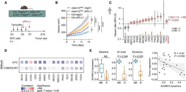 為探究ADAM12缺失是否增強(qiáng)免疫檢查點(diǎn)阻斷療效,研究團(tuán)隊(duì)對(duì)pCKO小鼠模型和對(duì)照小鼠均皮下接種KPC胰腺癌細(xì)胞系,并給與抗PD-L1治療(圖7A)。結(jié)果顯示,pCKO組抗PD-L1治療顯著抑制腫瘤生長(zhǎng)(圖7B)。為評(píng)估ADAM12在人類(lèi)癌癥中的臨床相關(guān)性,研究團(tuán)隊(duì)分析TCGA數(shù)據(jù)庫(kù)發(fā)現(xiàn),ADAM12高表達(dá)與多種癌癥類(lèi)型的不良預(yù)后相關(guān),且與CD8+ T細(xì)胞浸潤(rùn)水平呈負(fù)相關(guān)(圖7C-D)。進(jìn)一步分析結(jié)直腸癌和乳腺癌免疫治療隊(duì)列的單細(xì)胞測(cè)序數(shù)據(jù)顯示,與非應(yīng)答者相比,應(yīng)答者腫瘤成纖維細(xì)胞中ADAM12表達(dá)更低、ProgB/ProgC比值更高、TGF-β信號(hào)更弱而IFN-I反應(yīng)更強(qiáng)(圖7E)。在結(jié)直腸癌患者中,治療后腫瘤消退率與ADAM12表達(dá)下調(diào)程度呈正相關(guān),且ADAM12表達(dá)動(dòng)態(tài)與腫瘤反應(yīng)性CD8+ T細(xì)胞變化呈負(fù)相關(guān)(圖7E)。以上結(jié)果表明,ADAM12缺失可增強(qiáng)免疫檢查點(diǎn)阻斷療效,且ADAM12在人類(lèi)癌癥中與免疫治療應(yīng)答密切相關(guān),提示其作為治療靶點(diǎn)的潛在價(jià)值。