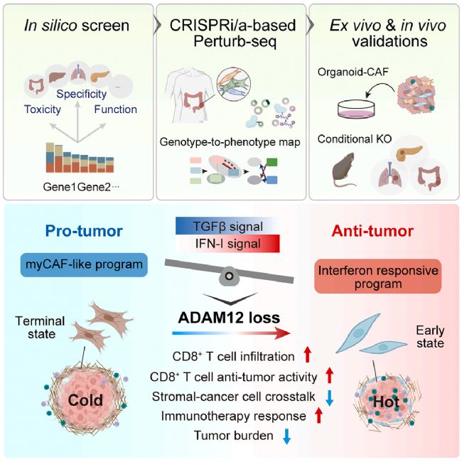 總之,該研究成功構(gòu)建了“計(jì)算預(yù)測(cè)→功能篩選→機(jī)制解析→療效驗(yàn)證”的完整研究路徑,系統(tǒng)揭示了CAFs中可被干預(yù)的“抗腫瘤軸線”,并識(shí)別出ADAM12為調(diào)控該過(guò)程的關(guān)鍵靶點(diǎn)。與具有廣泛毒副作用的TGFβ通路抑制方案相比,ADAM12在正常組織中表達(dá)極低,具備更高的治療特異性與安全性。該研究為克服免疫治療耐藥,尤其是改善‘冷腫瘤’微環(huán)境,提供了新的潛在策略與實(shí)驗(yàn)依據(jù)。
