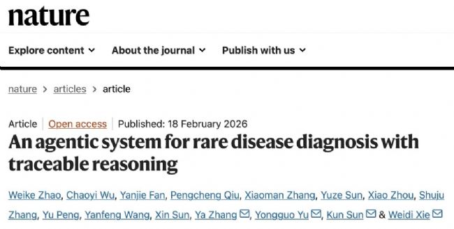 2026年2月18日,上海交通大學(xué)人工智能學(xué)院與上海人工智能實驗室的謝偉迪,上海交通大學(xué)醫(yī)學(xué)院附屬新華醫(yī)院的孫錕、余永國,以及上海交通大學(xué)人工智能學(xué)院與上海人工智能實驗室的張婭,作為共同通訊作者,于國際頂級學(xué)術(shù)期刊《Nature》發(fā)表了題為《An agentic system for rare disease diagnosis withtraceablereasoning》研究論文。該研究成功開發(fā)出全球首個針對罕見病的AI智能體循證推理診斷系統(tǒng)——DeepRare,在罕見病診斷的精準度方面,首次超越了擁有十年以上臨床經(jīng)驗的專家。此項成果不僅推動了罕見病診斷技術(shù)的進步,為全球三億罕見病患者帶來了實質(zhì)性的希望,更是人工智能在醫(yī)療領(lǐng)域應(yīng)用的一個重要里程碑,彰顯了大語言模型驅(qū)動的AI智能體系統(tǒng)如何對當前臨床工作流程進行革新性重塑。