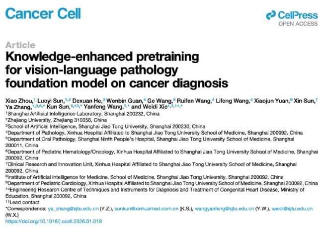次日,即2月19日,謝偉迪、王延峰、孫錕、張婭再次作為共同通訊作者,在《Cancer Cell》期刊上發(fā)表了題為《Knowledge-enhanced pretraining for vision-language pathology foundation model on cancer diagnosis》的研究論文。