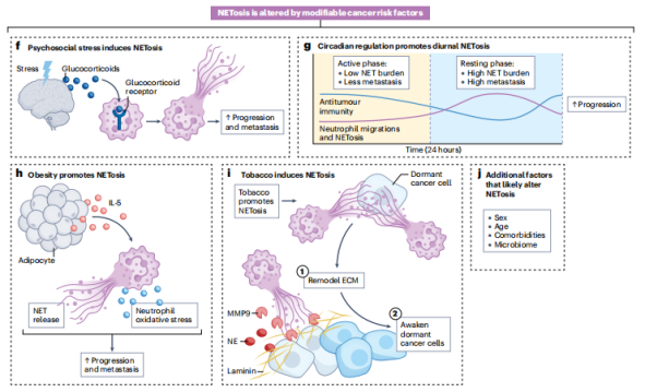 根據(jù)綜述總結(jié),NETs通過生化與物理雙重手段,從五個(gè)維度參與癌癥進(jìn)程的調(diào)節(jié):