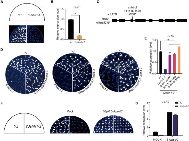 研究團(tuán)隊(duì)通過正向遺傳學(xué)篩選,在YJ報(bào)告株系背景下鑒定出一個(gè)新的突變體YJshh1-2,該突變體表現(xiàn)出LUC報(bào)告基因發(fā)光強(qiáng)度顯著減弱(圖1A)。RT-qPCR證實(shí)其LUC轉(zhuǎn)錄本水平顯著降低(圖1B)。通過遺傳互補(bǔ)實(shí)驗(yàn),將帶有原生啟動(dòng)子的SHH1基因(融合eGFP、3×FLAG或3×MYC標(biāo)簽)回補(bǔ)到Y(jié)Jshh1-2中,能夠完全恢復(fù)LUC的發(fā)光和表達(dá)(圖1D、E),證明表型確實(shí)由SHH1基因突變導(dǎo)致。此外,使用DNA甲基化抑制劑5-aza-2'-deoxycytidine (5-Aza-dC)處理YJshh1-2植株后,LUC表達(dá)得以恢復(fù)(圖1F、G),表明SHH1通過DNA甲基化通路調(diào)控LUC表達(dá),提示其具有拮抗由DNA甲基化介導(dǎo)的轉(zhuǎn)錄沉默功能。