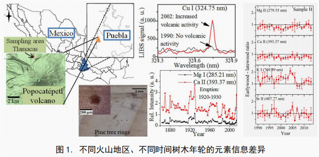 墨西哥波波卡特佩特火山具有2萬(wàn)多年的悠久噴發(fā)歷史,科研人員(Teran-Hinojosa E,2019)采集了此地區(qū)的樹(shù)芯樣品,利用LIBS技術(shù)成功識(shí)別出Al、Ca、C、Cu、Fe、Mg、Mn、K、Si、Na、Sr等11種關(guān)鍵元素,其中鈉(Na)、鎂(Mg)等輕元素的變化的與火山活動(dòng)直接相關(guān),為追溯火山噴發(fā)歷史提供了重要依據(jù)。