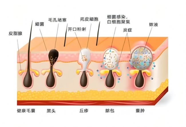 痤瘡(痘痘): 長期以來被認為是痤瘡丙酸桿菌過度增殖所致,但菌群多樣性降低、特定菌株比例失調才是關鍵。某些“好菌”減少,導致毛囊環(huán)境失衡,誘發(fā)粉刺和炎性丘疹。(結合癥狀:粉刺、炎性丘疹、膿皰)