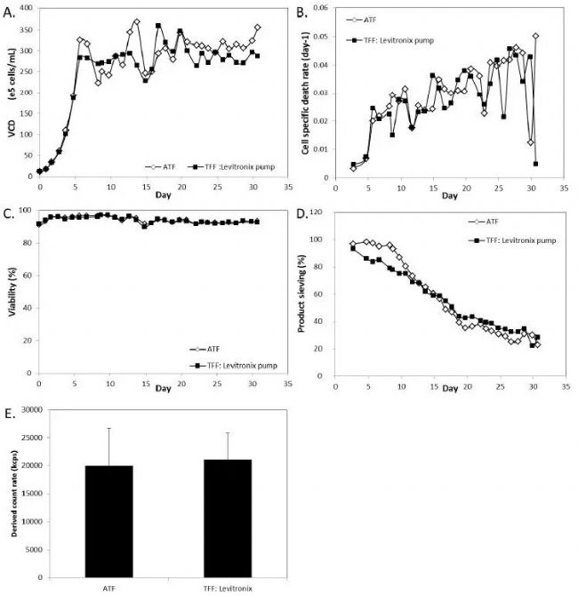 磁力泵TFF和ATF比較,低剪切的磁力離心泵可消除TFF和ATF的性能差異,獲得相近結(jié)果,包括A)VCD、B)LDH檢測(cè)所得的特異性細(xì)胞死亡率、C)活性、D)產(chǎn)物濾過(guò)以及E)培養(yǎng)液中100nm粒徑范圍的顆粒總數(shù)。