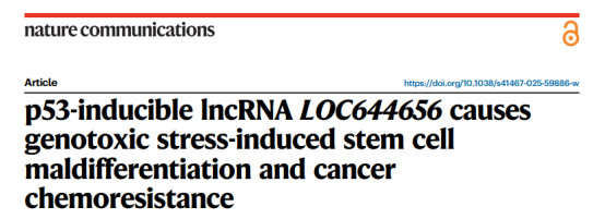 日本千葉大學(Chiba University)團隊于 2025 年 5 月 23 日在《Nature Communications》(《自然・通訊》)雜志發(fā)表了文章《p53-inducible lncRNA LOC644656 causes genotoxic stress-induced stem cell maldifferentiation and cancer chemoresistance》(《p53 誘導(dǎo)的長鏈非編碼 RNA LOC644656 導(dǎo)致基因毒性應(yīng)激誘導(dǎo)的干細胞分化異常及癌癥化療耐藥》),通過單細胞轉(zhuǎn)錄組測序(RNA-seq)、染色質(zhì)免疫沉淀測序(ChIP-seq)、轉(zhuǎn)座酶可及性染色質(zhì)測序(ATAC-seq)、互作組分析等多組學技術(shù),以及細胞生物學、動物實驗驗證,證實 p53 誘導(dǎo)的lncRNA LOC644656 是GSMD(基因毒性應(yīng)激誘導(dǎo)的干細胞分化異常)的關(guān)鍵調(diào)控因子。