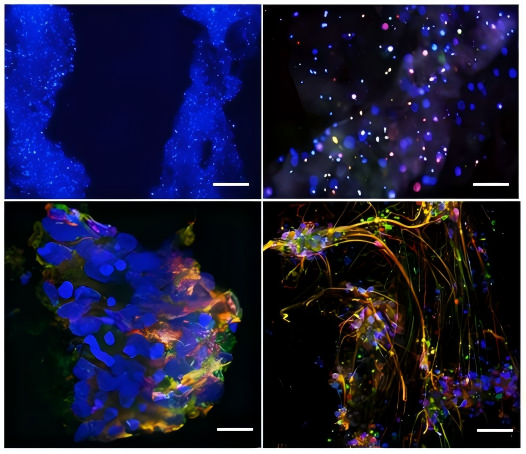 對于人類 iPSC 衍生的運動神經(jīng)元前體細胞和星形膠質(zhì)細胞,BIO X 同樣表現(xiàn)出色。打印后 1 天、1 周、3 周的檢測結(jié)果表明,細胞全程保持良好存活狀態(tài),均勻分布在支架內(nèi)部,為后續(xù)分化實驗奠定了堅實基礎(chǔ)。