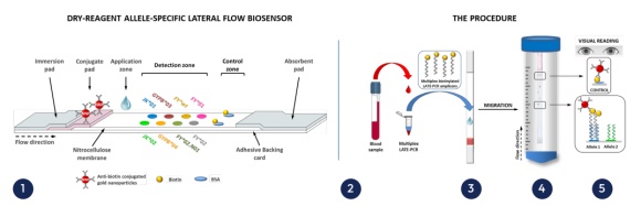 圖3:LFA 基因分型檢測流程示意圖:(1) 側(cè)向流檢測條結(jié)構(gòu)示意圖;(2) 通過 LATE-PCR 進行 DNA 擴增;(3) 試紙條加樣;(4) 與捕獲探針雜交;(5) 紅點可視化檢測。