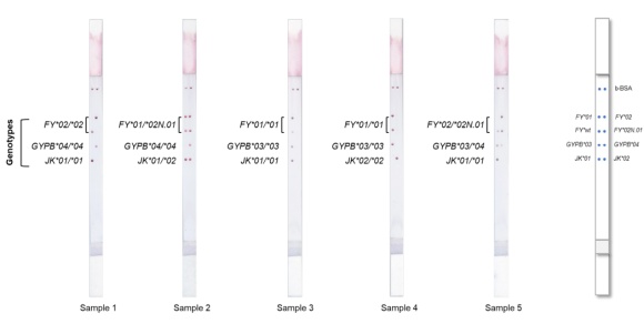 圖4:不同基因型的特異性雜交信號示例檢測條。5 份樣本均與預期分型結(jié)果匹配,符合率達 100%。