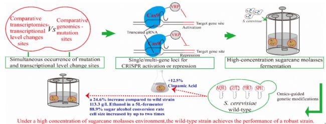 后續(xù)經(jīng)過多組學(xué)分析、CRISPR-VPR技術(shù)以及發(fā)酵中試驗(yàn)證,挖掘出打破高濃度甘蔗糖蜜限制釀酒酵母生長及活力的靶向位點(diǎn)PIR3、SPI1、AQR1和GUT2,于2026年發(fā)表在國際雙一區(qū)TOP期刊Bioresource Technology(非OA模式,IF=9.0),取得巨大成果(圖3)。