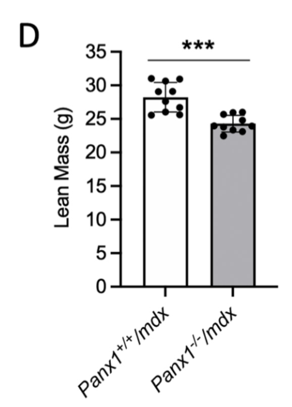 配圖:原文圖 2D(3 月齡小鼠瘦體重對(duì)比)標(biāo)注:清晰呈現(xiàn) Panx1⁻/⁻/mdx 小鼠與對(duì)照組的瘦體重差異,證實(shí) Panx1 敲除加劇瘦體重?fù)p失。