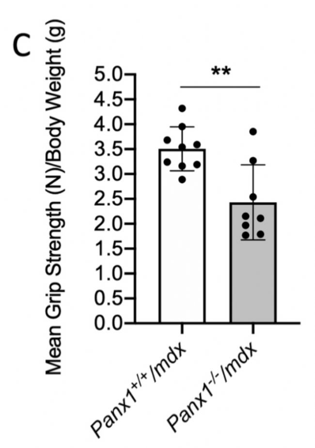 配圖:原文圖 5C(小鼠握力對(duì)比)標(biāo)注:量化展示 Panx1⁻/⁻/mdx 小鼠與對(duì)照組的握力差異,證實(shí) Panx1 敲除加劇肌肉無力