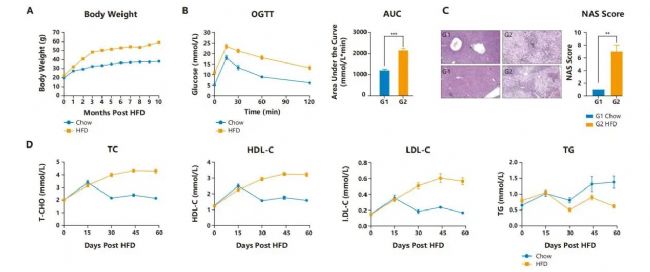 圖1. HFD誘導(dǎo)的C57BL/6 DIO小鼠的體重及GTT檢測(cè)。A. HFD喂養(yǎng)后,小鼠體重相較對(duì)照組明顯增加;B. DIO小鼠出現(xiàn)明顯的糖耐量異常;C. 肝臟HE染色;D. 血脂四項(xiàng)檢測(cè)。