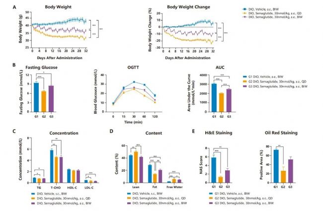 圖2. Semaglutide對(duì)HFD誘導(dǎo)的C57BL/6 DIO小鼠模型的影響。A. 小鼠體重曲線(xiàn);B. 小鼠空腹血糖及糖耐量檢測(cè)出現(xiàn)明顯的糖耐量異常;C. 小鼠血脂四項(xiàng)檢測(cè);D. 小鼠體成分檢測(cè);E. 小鼠肝臟HE染色及油紅染色評(píng)分。結(jié)果表明,Semaglutide可顯著降低DIO小鼠的體重及脂肪含量,改善血脂四項(xiàng)水平、糖耐量、空腹血糖等。