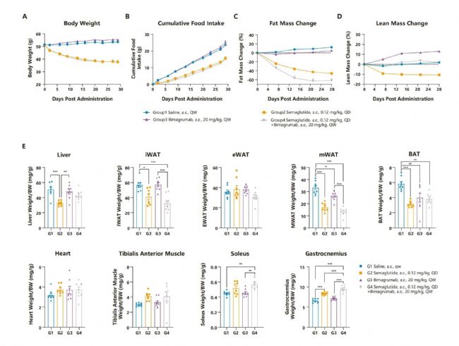 圖3. 在HFD誘導(dǎo)的DIO小鼠模型上聯(lián)合使用Semaglutide與Bimagrumab的藥效檢測(cè)。A-B. 聯(lián)合給藥后DIO小鼠體重、攝食量降低;C-D. 聯(lián)合給藥后,DIO小鼠脂肪組織重量顯著降低,相較單獨(dú)使用Semaglutide組,聯(lián)合給藥組小鼠的肌肉比例有回升,逆轉(zhuǎn)了Semaglutide減肌的副作用。E. 小鼠肝臟、腹股溝白色脂肪組織、附睪白色脂肪組織、腸系膜白色脂肪組織、棕色脂肪組織、心臟、腓腸肌、比目魚(yú)肌、脛骨前肌的相對(duì)重量。