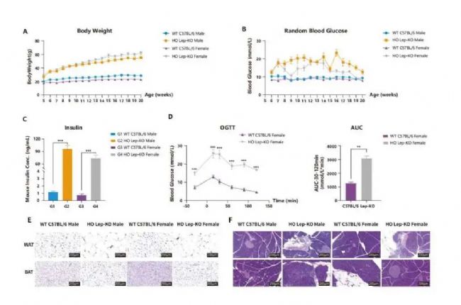 圖4. Lep-KO小鼠的驗(yàn)證。A. 小鼠體重變化;B. Lep-KO小鼠血糖變化;C. Lep-KO小鼠的胰島素水平(20周齡); D. Lep-KO小鼠表現(xiàn)出明顯的糖耐量異常(雌性,6周齡);E. Lep-KO小鼠皮下脂肪組織的H&E染色:Lep-KO小鼠脂肪細(xì)胞體積更大;F. Lep-KO小鼠胰腺的代表性圖片:Lep-KO小鼠胰腺有炎性細(xì)胞浸潤(rùn)。