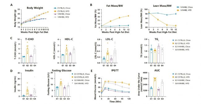 圖5. HFD誘導(dǎo)的INHBE人源化DIO小鼠(HO)的指標(biāo)結(jié)果。A. 小鼠體重曲線(xiàn);B. 小鼠體成分比值;C. 小鼠血脂四項(xiàng)檢測(cè);D. 小鼠胰島素水平、空腹血糖;E. 小鼠糖耐量檢測(cè)。結(jié)果表明,HFD誘導(dǎo)的INHBE人源化DIO小鼠體重及脂肪含量增加、代謝異常。