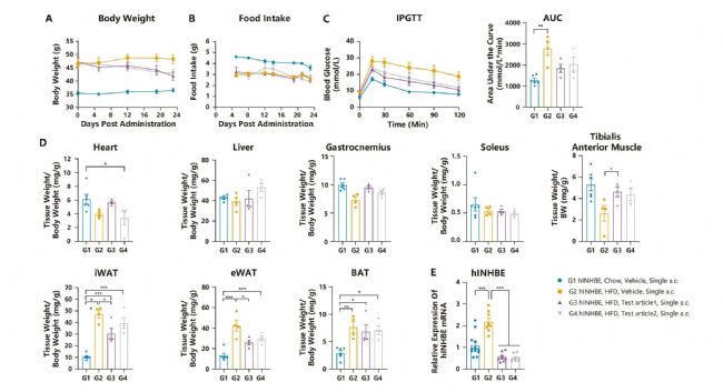 圖6. HFD誘導(dǎo)的INHBE人源化DIO小鼠(HO)模型的siRNA藥物藥效檢測(cè)。A. 小鼠體重曲線(xiàn);B. 小鼠攝食量曲線(xiàn);C. 小鼠糖耐量檢測(cè);D. 小鼠心臟、肝臟、腓腸肌、比目魚(yú)肌、脛骨前肌、腹股溝白色脂肪組織、附睪白色脂肪組織、棕色脂肪組織的相對(duì)重量。E. 小鼠肝臟內(nèi)人源INHBE的mRNA水平。