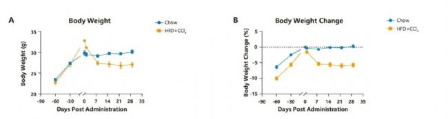 圖9. HFD+CCl4誘導(dǎo)(60% high fat diet for 8-10weeks + 10% CCl4)C57BL/6小鼠MASH模型構(gòu)建。A. 小鼠體重曲線(xiàn);B. 小鼠體重變化情況。