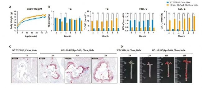 圖11. 普通飲食條件下Ldlr-KO/ApoE-KO雄性小鼠的表型。 A. 小鼠體重曲線(xiàn); B. 小鼠血脂四項(xiàng); C. 主動(dòng)脈瓣Masson染色; D. 主動(dòng)脈瓣及主動(dòng)脈油紅O染色。