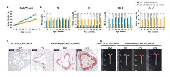 圖14. 特殊誘導(dǎo)飲食條件下Ldlr-KO/ApoE-KO雌性小鼠的表型。A. 小鼠體重曲線(xiàn);B. 小鼠血脂四項(xiàng);C. 主動(dòng)脈瓣油紅O染色;D. 主動(dòng)脈瓣及主動(dòng)脈油紅O染色。